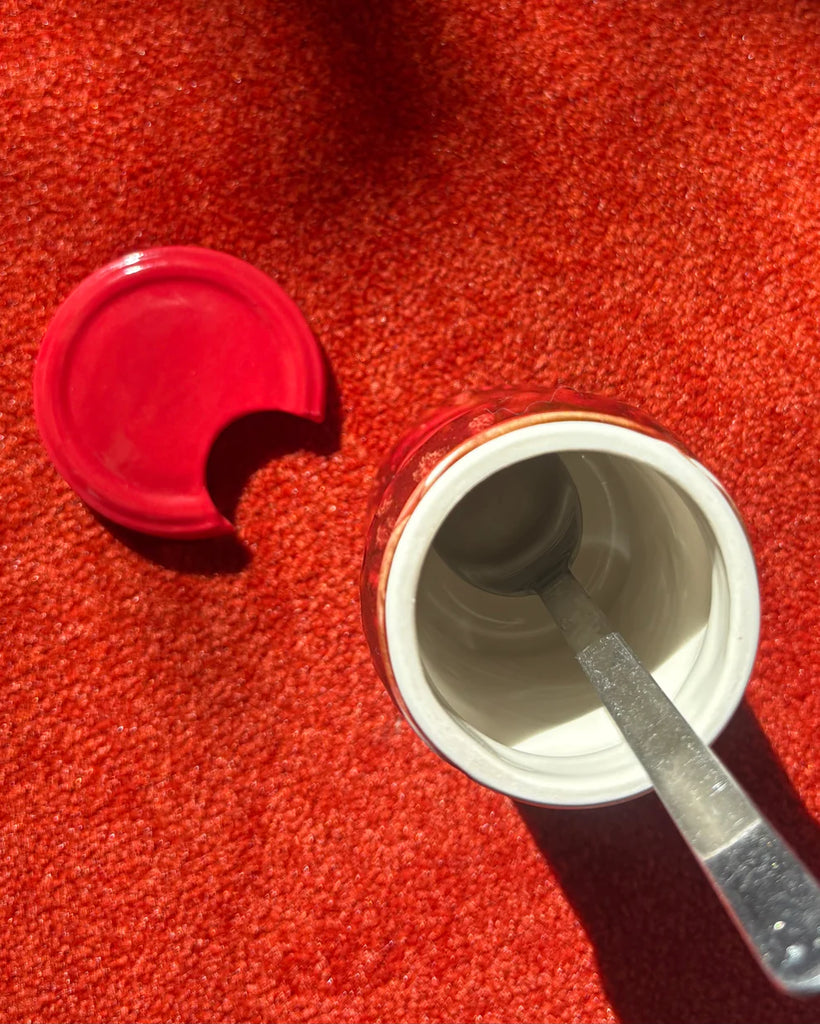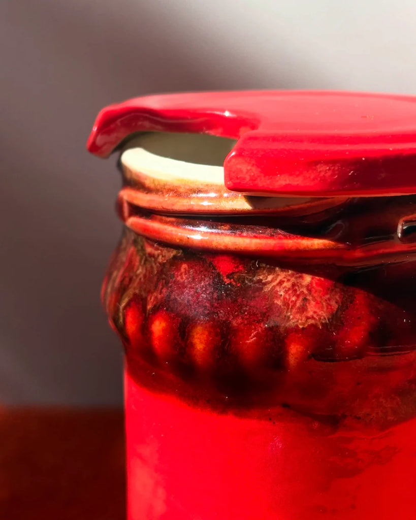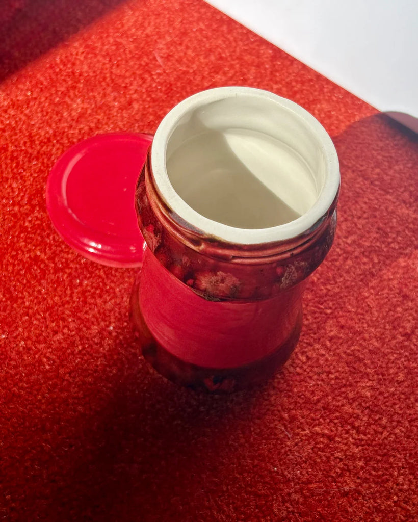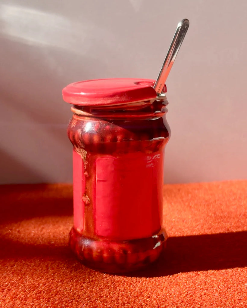 Your favourite chilli oil crisp now in ceramic form. Slipcast from a 210g Lao Gan Ma jar, it is 80% of the actual size. This condiment icon can be used as a chilli jar or as a vase. The lid has a little cut out so a spoon can be slotted in place. The lid sits loosely on top of the jar.